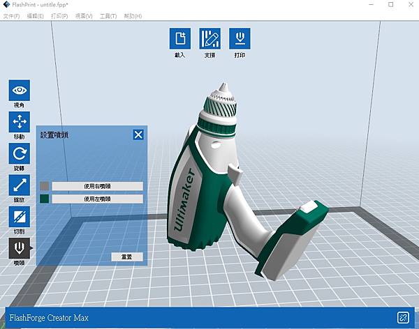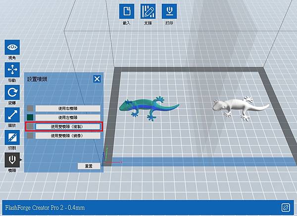 這時左右噴頭可以同時列印個模型, 在同樣時間裡面可以一次完成兩個左右相反的模型.