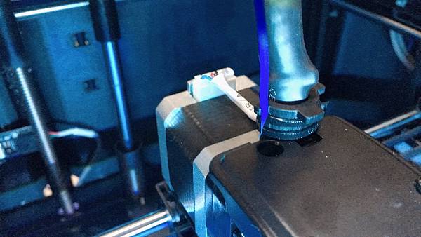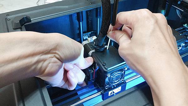 等噴頭加熱完畢之後, 齒輪就會把絲料往上捲退出, 按下噴頭旁邊的壓板, 就能把絲料往上抽出.