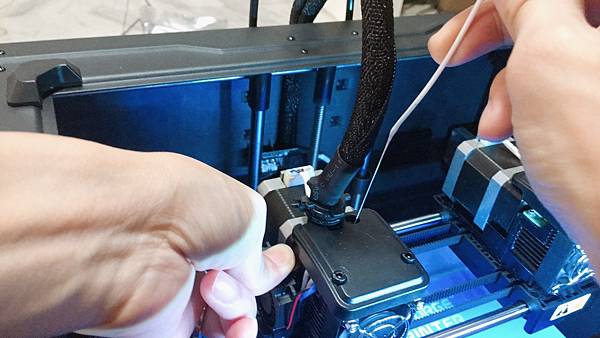 絲料前端先用斜口鉗剪45度. 裝上導管, 並且裝上耗材, 注意耗材是交叉安裝, 方向也要順著導管.