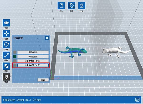 獨立雙噴頭的特色, 在切片軟體裡面選擇左下方"使用雙噴頭(鏡像)"功能, 可以把模型鏡像, 變成文武向(左右相反).